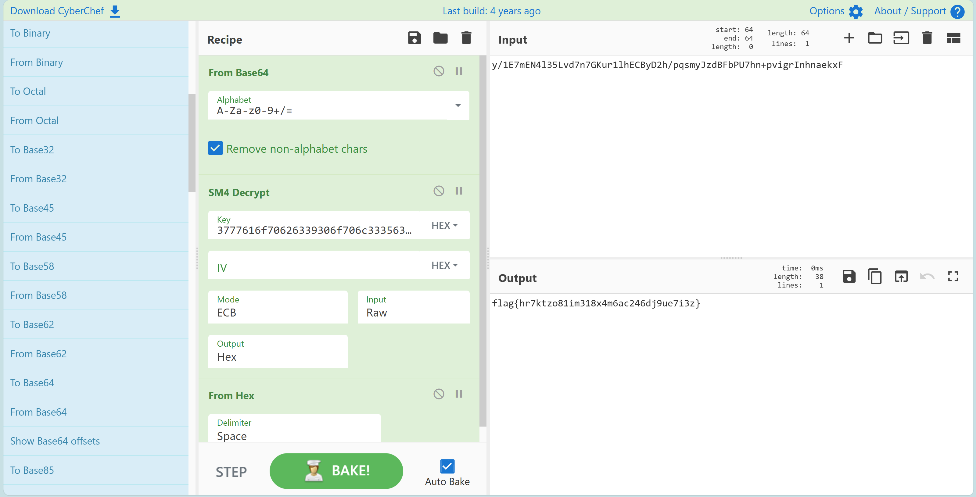挖藕我看到了什么?是SM4加密哦。既然有了key和iv(初始化向量。但大概不是这里的3,我也不清楚,不需要这个似乎也能解密),那再把这个任务交给cyberchef就行了。