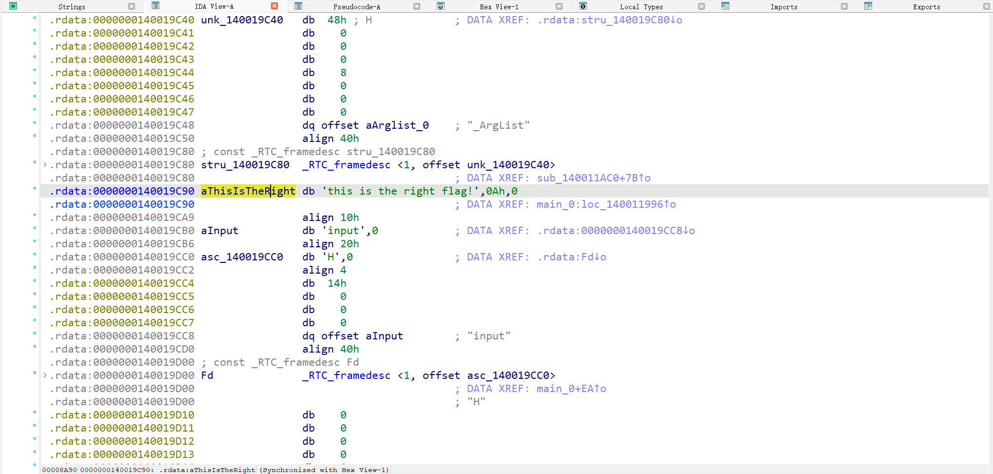 使用IDA打开之后可以先查找主函数or使用Shift+F12查找字符串。(我做的时候是使用后者,但现在看前者更直接。)